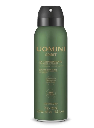 O Desodorante Aerossol Antitranspirante Uomini Spirit de O Boticário oferece proteção eficaz contra suor e odores, com uma fragrância masculina marcante e sofisticada. Inspirado na linha Uomini Spirit, combina frescor com notas amadeiradas aromáticas, trazendo uma sensação de limpeza e elegância ao longo do dia.